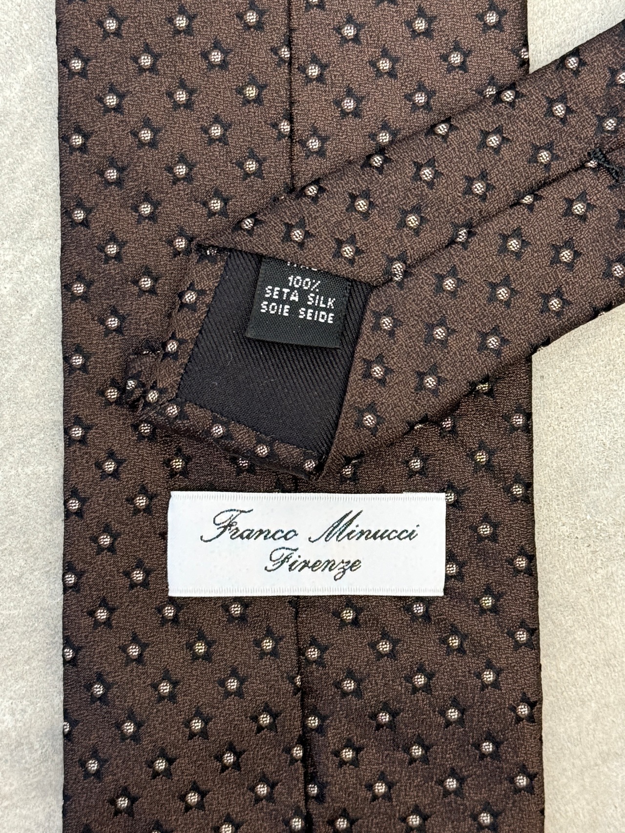 1983年、セレクトショップ「TIE YOUR TIE(タイ ユア タイ)」をオープン。フランコ ミヌッチはそのオリジナルブランド。アイテムの中で有名なのは、1枚のシルクを7つ折りにして作る「セッテピエゲ」と呼ばれるネクタイ。芯地を使わず、通常の2倍の生地を使用する。高い技術を要するため職人の数も少なく、贅沢で貴重なアイテム。